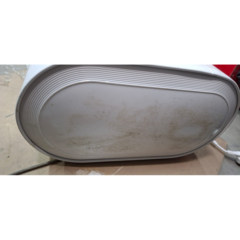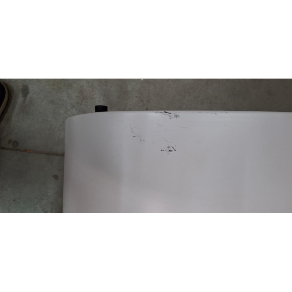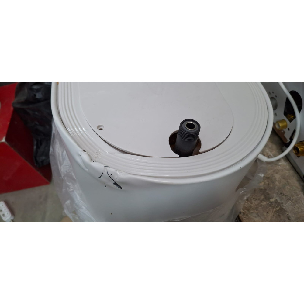 Сильная деформация по нижней обечайке, разбит декоративный пластиковый кожух защиты, потертости без повреждения л/к покрытия по всему водонагревателю.