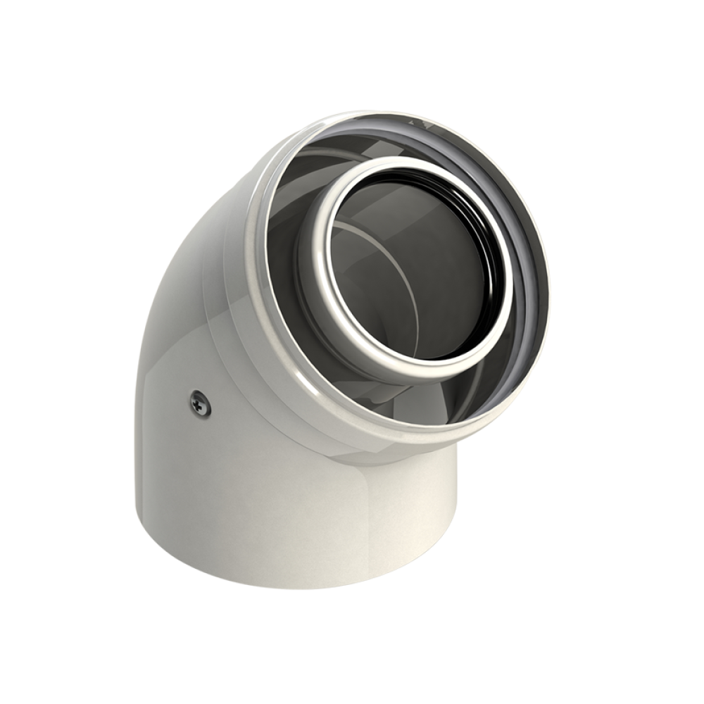 Коаксиальное колено Ø60/100 мм для изменения направления потоков воздуха и дымовых газов на 45°.