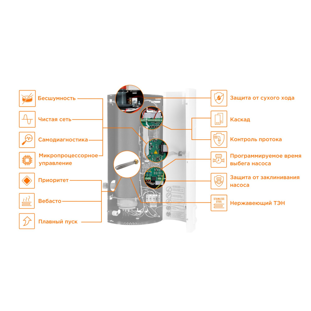 Мощность 6 кВт, 220 В, группа ТЭН 3х2 кВт из нержавеющей стали. Микропроцессорное управление, симисторные ключи, расширенная цифровая, светодиодная и звуковая индикация, модуляция мощности, плавный пуск с предварительным подогревом, ротация ТЭН, реле давления, интеллектуальный выход контроля протока, возможность каскадного подключения, дежурная подсветка. Вход для внешнего термостата и погодозависимой автоматики. Размер ВхШхГ — 710х323х172. Присоединительный размер 1".